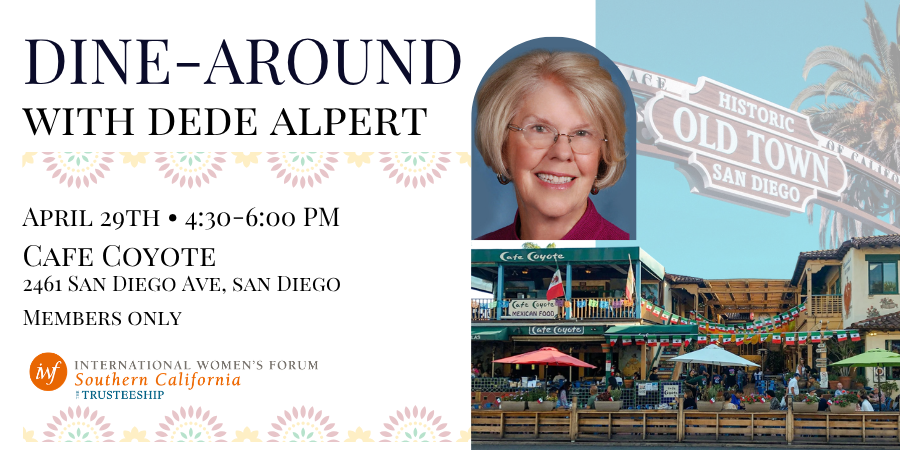 Join Dede Alpert on Wednesday April 29 at 4:30 pm for a Dine-Around in Old Town San Diego. Watch how tortillas are made, learn how to make the perfect margarita & then sit down to appetizers and your freshly made margarita. Dede is the former State Senator and former Assembly Person for San Diego and has been an IWF So Cal member since 2006.