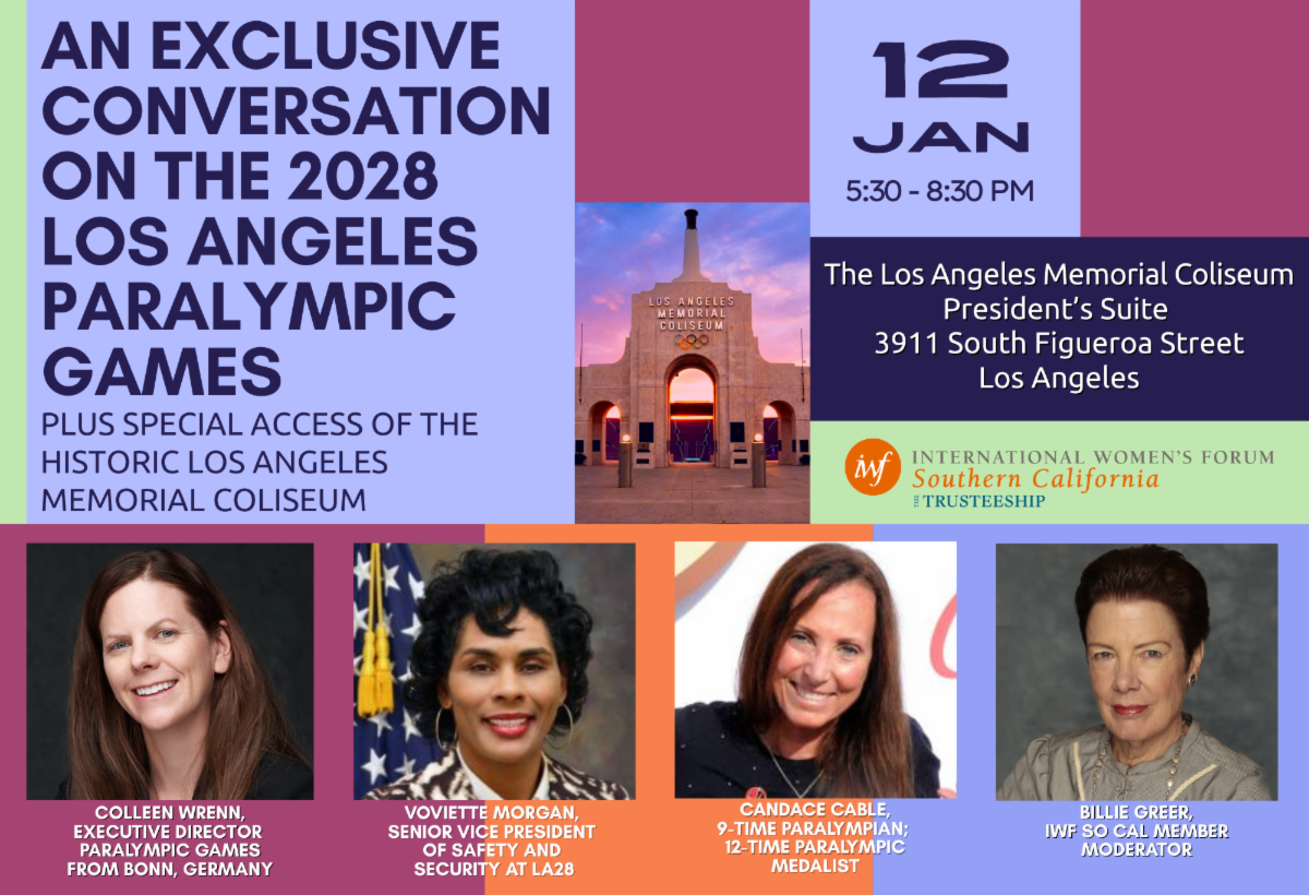 Los Angeles will make history in 2028 as host of the Summer Olympic Games for the third time, and as the first U.S. city since Atlanta in 1996 to welcome the Summer Paralympic Games. Much of the Paralympic action will unfold in Exposition Park at the Los Angeles Memorial Coliseum. Join us for an inspiring and insightful program at the iconic Coliseum as we celebrate global excellence, human resilience, and Los Angeles’ leading role in shaping the future of sport. Many thanks to our evening moderator and IWF So Cal member Billie Greer for hosting our light dinner.